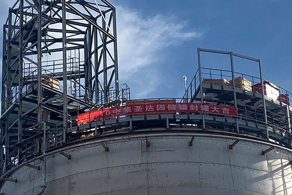 上午9点18分,圣达因公司许震主任宣布封罐,现场开始进行储罐封门焊接,同时鸣放礼花庆祝。